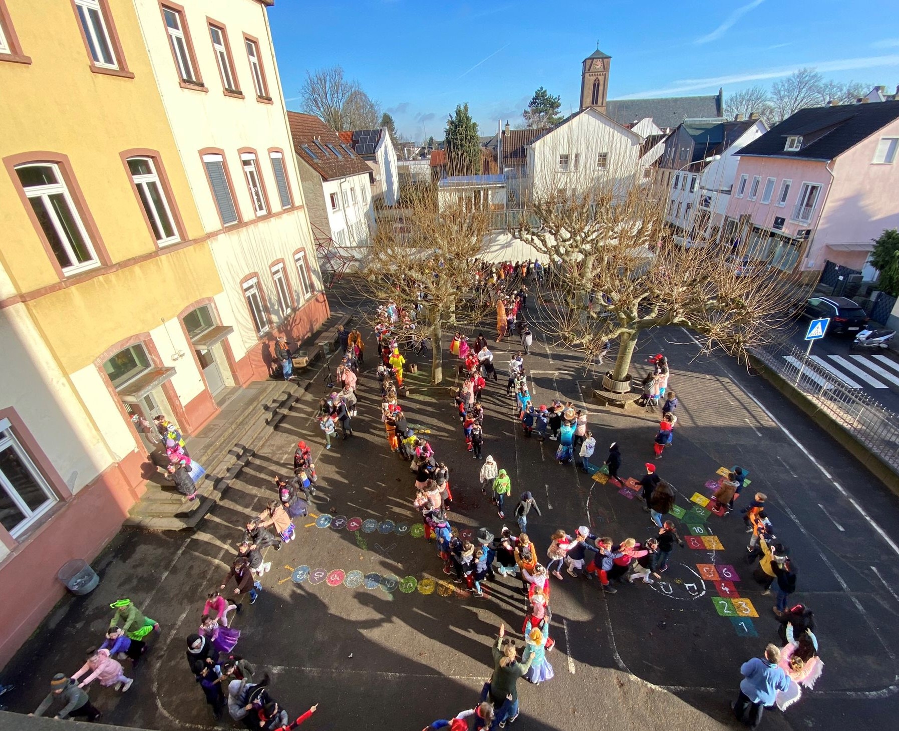 Heute versammelte sich die gesamte Schülerschaft zu einem fröhlichen Fest auf dem Schulhof. Die Musik erklang aus den Lautsprechern und schon bald setzte sich eine bunte Polonaise in Bewegung. Kinder in fanatsievollen Kostümen tanzten und lachten miteinander. Die Stimmung war ansteckend und alle genossen die ausgelassene Atmopshäre.