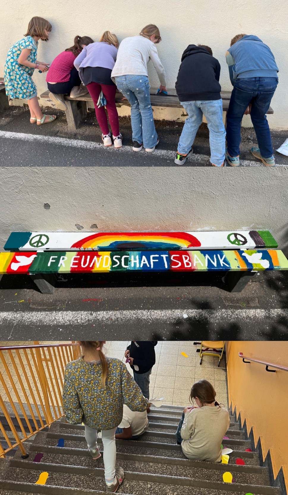Im Rahmen des Friedens-Projekts entstanden eine Freundschaftsbank und mobile Streitschlichtungsteppiche. Die Freundschaftsbank auf dem Schulhof bietet Kindern, die in der Pause keine Spielpartner haben, die Möglichkeit, neue Freunde zu finden. Die mobilen Streitschlichterteppiche können in den Klassen zur Klärung von Streitigkeiten benutzt werden. Außerdem haben die Kinder die Fußspuren im Treppenhaus erneuert, um das Konfliktpotential durch gegeneinander stoßende Kinder zu entschärfen und an jedem Eingang Schilder aufgehängt, die die Kinder daran erinnern sollen friedvoll miteinander umzugehen. Ein neu eingeführtes wechselndes Motto des Monats (zum Beispiel: Bitte und Danke sagen) hängt nun gut sichtbar im Treppenhaus und soll zudem zu einem guten Miteinander in der Robert-Schumann-Schule beitragen.