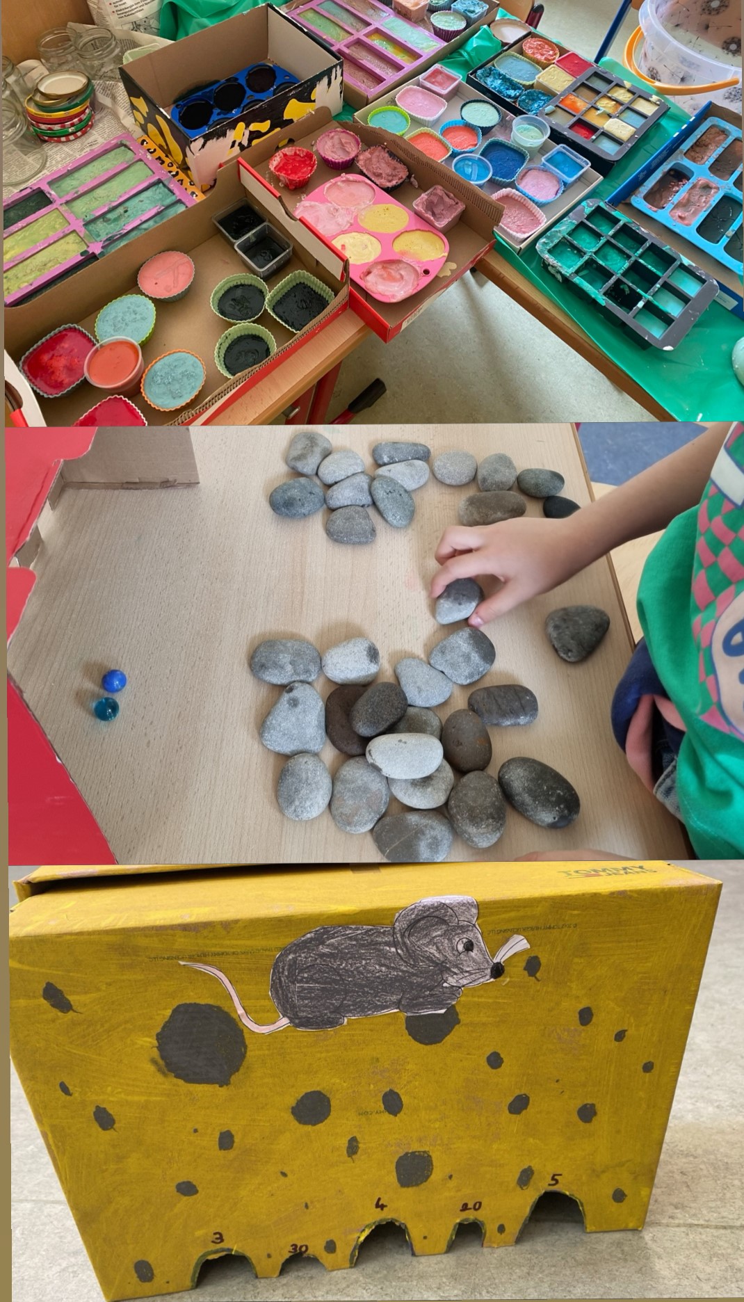 Nicht immer muss man alles neu und aus Plastik kaufen, Steine und andere Naturmaterialien eignen sich ebenfalls wunderbar zum Spielen. Insgesamt 47 Kinder konnten in den 3 Gruppen die verschiedensten Spiele aus aller Welt kennenlernen und ausgiebig ausprobieren. Neben Knete und Kreide wurden auch Seifenblasen selbst hergestellt und eigene Spiele gebastelt.