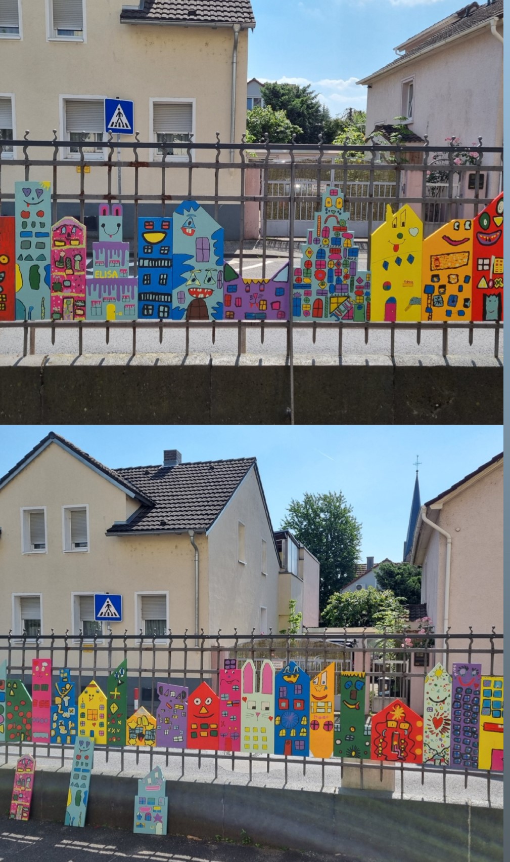 Die Kinder der Rizzi Zaungruppe gestalteten in Anlehnung an den Künstler James Rizzi eine Zaunverkleidung. Es wurde gesägt,geschmirgelt und vor allem mit viel Farbe gearbeitet.